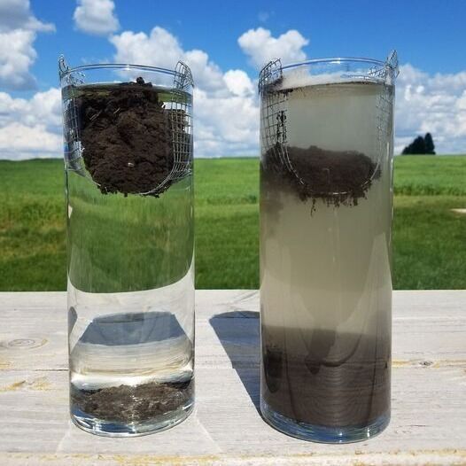 La foto è stata scattata circa due minuti dopo che i campioni sono stati immersi in acqua. Il terreno arato si è praticamente disgregato al contatto con l'acqua: l'aratura ripetuta ha compromesso la sua struttura, eliminando gli spazi interstiziali e la “colla” biologica che aiuta a mantenerlo coeso. Invece, il terreno non arato presenta un'ottima porosità e una vivace attività biologica, conferendogli una struttura sana e resistente allo shock idrico.